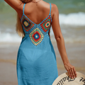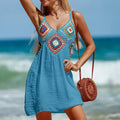 Robe de plage d'été pour femmes, bordure croisée, sexy, crochet à la main, pull, motif élégant, cache-maillot de bain , nouvelle collection, cache-maillot de bain pour femmes, mini robe de plage, été, bohème, vintage, sans manches, col en V, découpe, patchwork, courte, robe d'été, maillots de bain